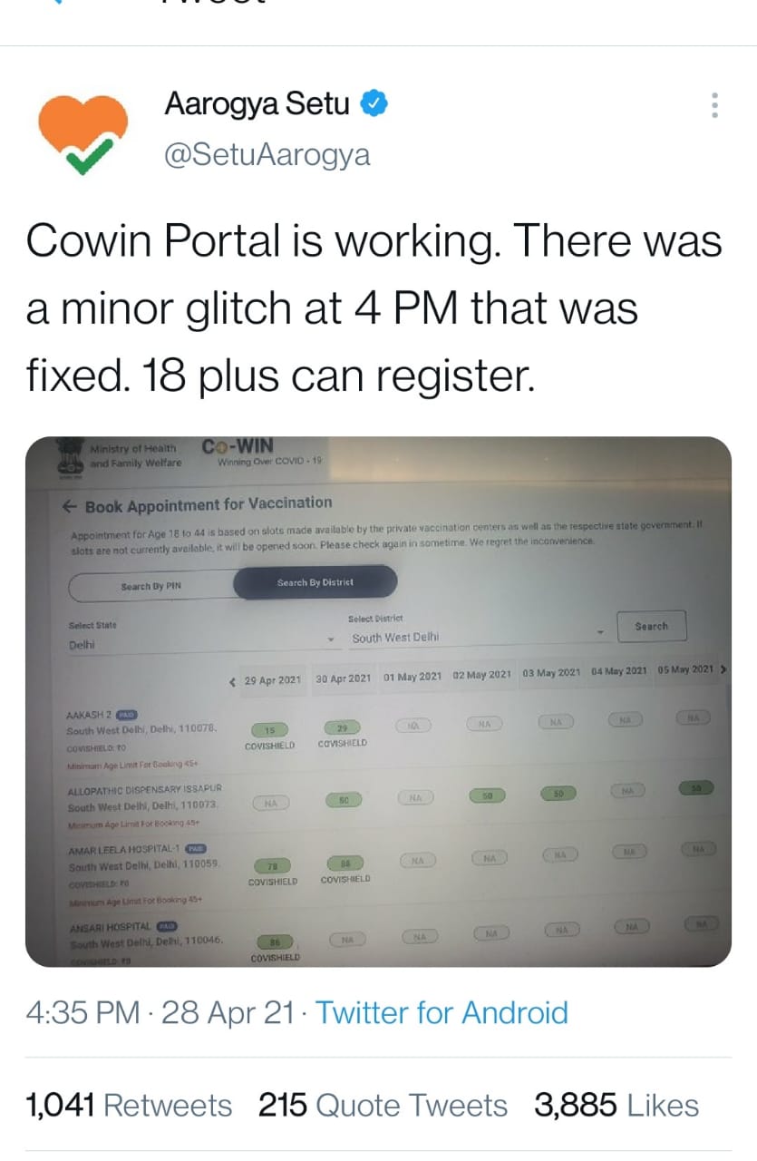 वेबसाइट और एप में दिक्कत की शिकायत के बाद आरोग्य सेतु ने ट्वीट कर कहा है कि कोविन पोर्टल अब ठीक से काम कर रहा है।